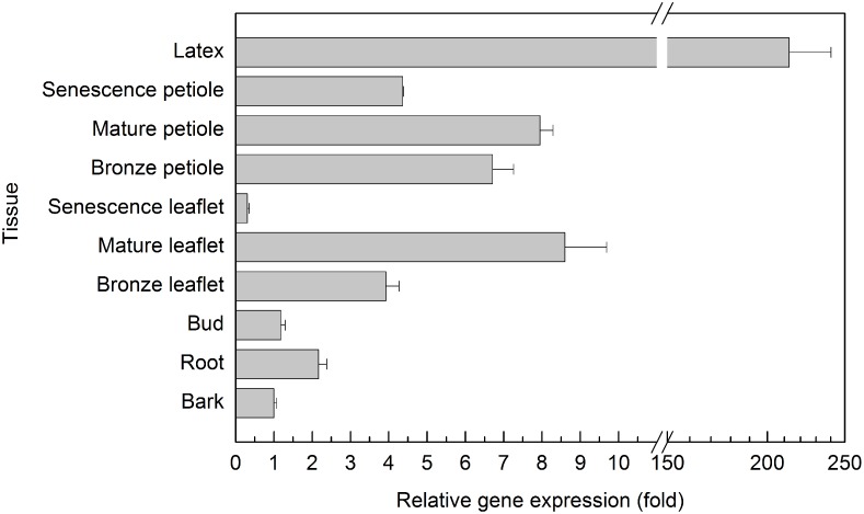 Fig 6. Expression of HbPIP2;3 in different rubber tree tissues.The relative gene expression was calculated by using HbYLS8 as the house-keeping gene and bark as the normalization sample. The tissues were obtained from tissue cultured CATAS7-33-97 rubber tree saplings (about eight-month-old). All quantitative RT-PCR assays were conducted in triplicate.