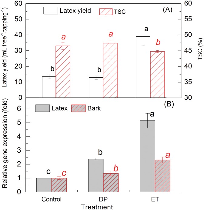 Fig 8. Comparison of wounding and Ethrel stimulation on latex yield and HbPIP2;3 expression.(A) Change in latex yield and total solid content (TSC) and, (B) HbPIP2;3 transcript expression in the virgin rubber trees (Control) and rubber trees subjected to drawing pin wounding (DP) and Ethrel (ET) treatments. The rubber clone was CATAS7-33-97. Data are given as means ± SD (n = 3) from three trees. Different letters indicate significant differences between means (P<0.05).