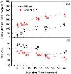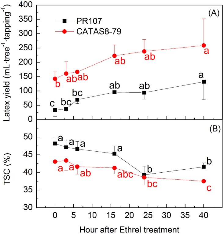 Fig 9. Kinetics of latex yield (A) and TSC (B) subjected to different duration of Ethrel treatment.The regularly tapped rubber clones with different responses to Ethrel stimulation were compared. The yield of PR107 responds well to Ethrel stimulation whereas CATAS8-79 rubber clone displays a relatively poor response to Ethrel stimulation. Data are means ± SD (n = 3) for each including three trees. Different letters represent latex yield or TSCs that are significantly different (P<0.05).