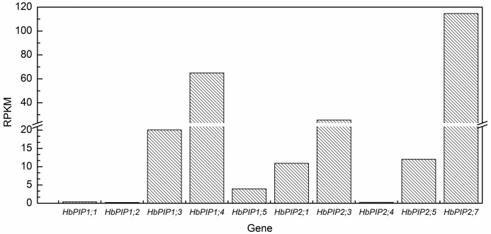 Fig 1. The transcriptional profile of ten PIP genes identified in the rubber tree latex.The expression analysis was based on the Solexa sequencing data of RRIM928 latex transcriptome downloaded from NCBI (SRA accession number SRX278514). RPKM refers to reads per kilobase per million (see details in methods). HbPIP1;1 and HbPIP2;1 were previously reported by Tungngoen et al. [23, 28], whereas HbPIP1;4 and HbPIP2;7 were reported as HbPIP1 and HbPIP2 by Zhuang et al. [31], respectively.