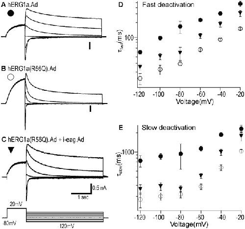 Fig 5. Adenoviral i-eag domains restored slow deactivation in hiPSC-CMs.Representative tail currents recorded from hiPSC-CMs infected by: A, WT hERG1a.Ad; B, hERG1a(R56Q).Ad; C, hERG1a(R56Q).Ad + i-eag.Ad. Inset represents the voltage protocol used. D, Tails were fit with a double exponential function, and mean τfast (top) and τslow (bottom) values were plotted against voltage on a logarithmic scale. All values were plotted as mean ± S.E.M.; n> = 15 cells. |