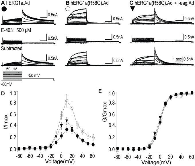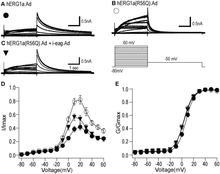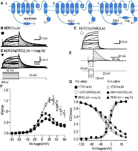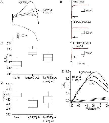 Fig 1. Adenoviral i-eag domains rescue the gating-deficiencies of hERG1a(R56Q) channels expressed in HEK293 cells.