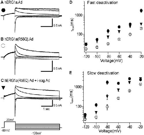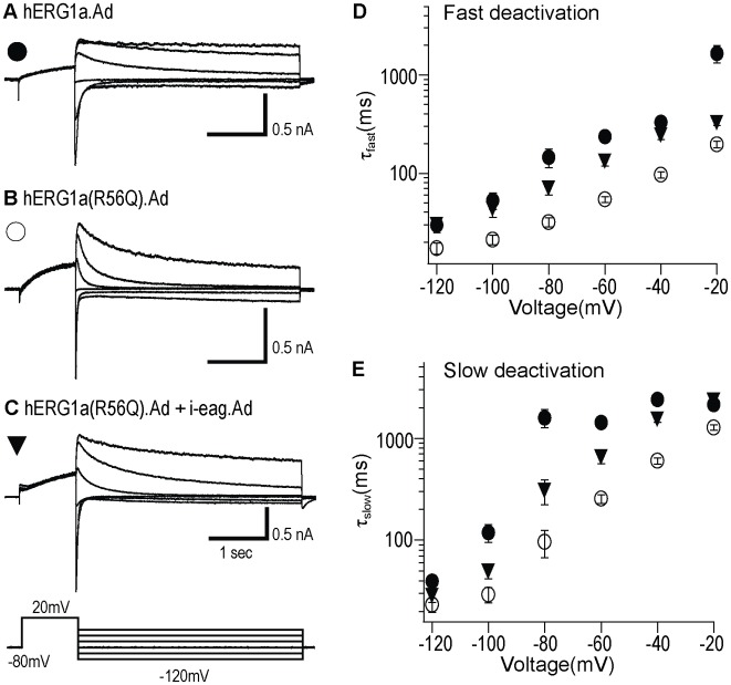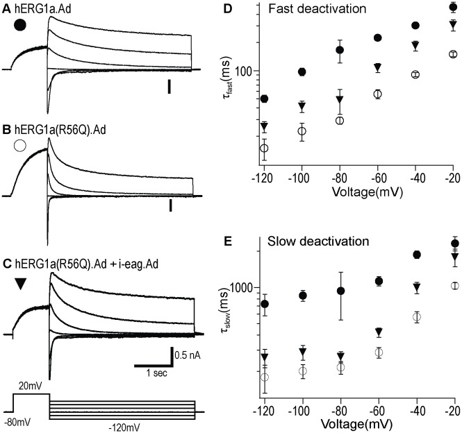 Fig 2. Adenoviral i-eag domains restore slow deactivation in HEK293 cells.Representative tail current recordings from HEK293 cells expressing: A, WT hERG1a.Ad; B, hERG1a(R56Q).Ad; C, hERG1a(R56Q).Ad + i-eag.Ad. Inset represents the voltage protocol used. D, Tail currents were fit with a double exponential function and the mean τfast (top) and τslow (bottom) values were plotted against voltage on a logarithmic scale. All values were plotted as mean ± S.E.M; n = 6–8 cells. |