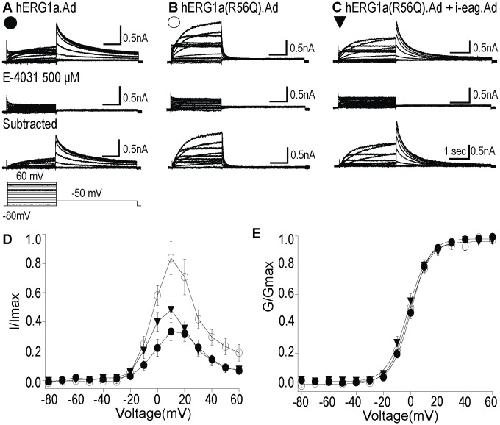 Fig 6. hERG currents were isolated as E-4031 sensitive current.hERG currents overexpressed in hiPSC-CMs were isolated as E-4031-sensitive currents. A,B,C, The data showed families of current traces for WT hERG1a.Ad, hERG1a(R56Q).Ad and hERG1a(R56Q) + i-eag.Ad (top), after the addition of E4031(500 μM; Middle), and digitally subtracted traces to give the E-4031 sensitive currents (bottom). D, I-V relationships for each hERG channel above. The current at the end of depolarizing step was normalized to the maximum tail current and plotted versus voltage. E, Steady-state activation curves for each hERG channel above. All values were plotted as mean ± S.E.M.; n> = 15 cells. |