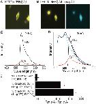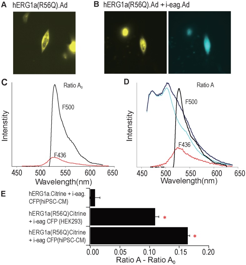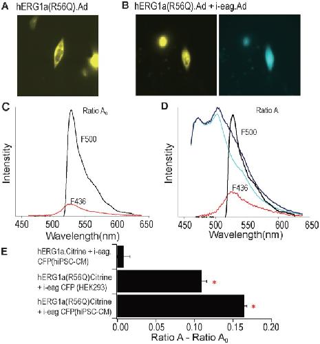 Fig 7. FRET between i-eag domains and hERG R56Q channels in hiPSCs.Images of cells: A, hERG1a(R56Q).Citrine.Ad; B, hERG1a(R56Q).Citrine.Ad + i-eag.CFP.Ad. C, Determination of Ratio A0. The emission spectra from hiPSCs expressing hERG1a(R56Q).Citrine was determined with excitation at 436 nm and 500 nm. Ratio A0 is the F436 spectra normalized to F500 spectra. D, Spectra method for measuring FRET and determining Ratio A. Spectra (dark blue trace) was measured from cells coexpressing i-eag.CFP.Ad + hERG1a(R56Q).Citrine.Ad by excitation at 436nm. Emission spectra of CFP (cyan) were measured in a control experiment from hiPSCs expressing i-eag.CFP. Extracted spectra (F436, red trace) is the cyan spectra subtracted from the dark blue trace and contains the emission of Citrine. Spectrum (F500, black trace) was measured from excitation of Citrine at 500 nm. Ratio A is the F436 spectra normalized to F500 spectra. E, Bar graph of Ratio A- Ratio A0, a value directly related to FRET efficiency. n = 7–9 cells. *p<0.05 for FRET between hERG1a(R56Q) and i-eag-CFP domains compared to hERG1a and i-eag-CFP control. |