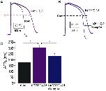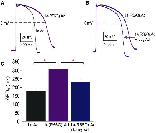 Fig 8. i-eag domains regulate action potentials.Current clamp recording of action potentials from hiPSC-CMs expressing WT hERG1a.Ad, hERG1a(R56Q).Ad and hERG1a(R56Q).Ad + i-eag.Ad. A, hERG1a(R56Q) increased the action potential duration (*p <0.05 compared to WT hERG1a.Ad). B, Coexpression of i-eag.Ad decreased the action potential duration in cells with hERG1a(R56Q) (*p <0.05 compared to hERG1a(R56Q).Ad). C, Histogram of APD90 values in hiPSC-CMs infected by WT hERG1a.Ad, hERG1a(R56Q).Ad, and hERG1a(R56Q).Ad + i-eag.Ad. n = 12 for each. Scale bar is 50 s and 20 mV. |