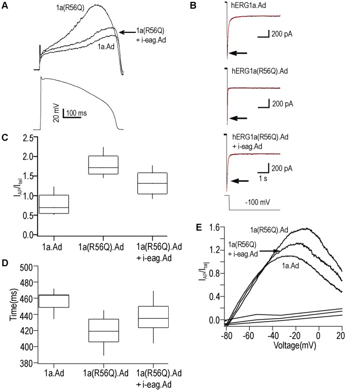Fig 3. Adenoviral i-eag domains regulated the hERG R56Q current recorded with an AP waveform command.Representative current recordings: A (top) from WT hERG1a (black), hERG1a R56Q (red), and hERG R56Q + i-eag (blue) elicited with a voltage command mimicking a ventricular action potential A (bottom). B, Tail currents were generated by a step to −100 from 60 mV from same cells as in A). Double exponential fits (red traces) were extrapolated back to the moment of voltage change to obtain the peak tail current value (arrow). C, Box plot of peak currents elicited with AP command voltage (as in A) were normalized to peak tail current (as in B) to normalize for variations in channel expression between cells. D, Box plot of the time of the peak current elicited with the AP command voltage. For box plots, the middle line is the mean, the top and bottom lines are the 75th and 25th percentiles, respectively, and the straight lines are the 90th and 10th percentiles. n = 6–9 cells.E, Plot of currents in A) versus AP command voltage. |