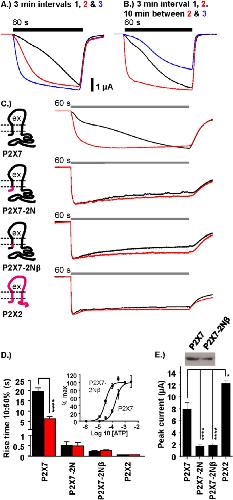 A, representative traces showing the speeding/facilitation of WT P2X7 receptor responses to prolonged (60 s, bar) repeat applications of 1 mm ATP at 3-min intervals (black, red, and blue trace consecutively). B, increasing the time interval between repeat ATP applications 2 and 3 (black trace to red trace, 3-min interval; red trace to blue trace, 10-min interval) returns the receptor response back to its naïve state. C, schematics and representative traces showing the effect of replacing the entire N terminus of the hP2X7 receptor (black) with that of hP2X2 receptor (magenta) or just the 16 pre-TM1 amino acids (P2X7–2Nβ). Traces represent first (black) and second (red) receptor responses (60-s application at 3-min intervals) to 1 mm ATP. ex, the extracellular region of the receptor. D, histogram summary showing the 10–50% rise times (seconds) of the first (black) versus second (red) receptor response to EC90 ATP (1 mm ATP at P2X7 and 100 μm ATP at P2X7–2N, P2X7–2Nβ, and P2X2) at 3-min intervals. Inset, concentration response to ATP for P2X7 and P2X7–2Nβ receptors. E, histogram summary showing the peak amplitude (microamperes) of the response to the first ATP application. Inset, representative Western blot of the equivalent levels of surface expression of P2X7 and P2X7–2Nβ receptors. Data are mean ± S.E. (n = 7–25). *, p < 0.05; ****, p < 0.0001. |