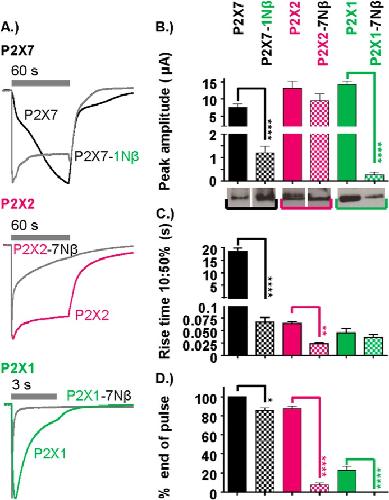 A, normalized traces demonstrating the effect on the time course of pre-TM1 β-region substitution of P2X1 into P2X7, P2X7 into P2X2, and P2X7 into P2X1 receptors, respectively. In each case, ATP was applied for the duration indicated by the gray bars (1 mm for P2X7 and P2X7–1Nβ and 100 μm for P2X1 and P2X2 WT receptors and chimeras). B—D, histograms showing the peak current amplitude (microamperes), 10–50% rise time (seconds), and percent current remaining at the end of the ATP pulse (EC90 concentration of ATP applied for the duration as indicated on the adjacent traces). Western blots show the surface expression of the respective WT and chimeric receptors. For P2X2 and P2X7 receptors, the lanes are from the same blot and exposure, and the white line between them indicates that they have been reordered from that loaded on the gel. Data are mean ± S.E. (n = 4–25). *, p < 0.05; **, p < 0.01; ****, p < 0.0001. |