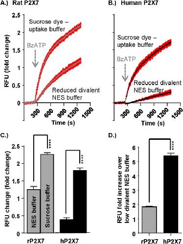 A and B, representative FlexStation responses showing agonist-induced dye uptake through the rat (A) and human (B) P2X7 receptor when preloaded for 30 min with ethidium bromide (20 μm) under different buffer conditions (sucrose dye uptake buffer versus normal extracellular solution low divalent buffer). Agonist addition (300 μm BzATP) at 240 s is indicated by the arrow. C, histogram summary showing the total RFU (relative fluorescence units) change under the different buffer loading conditions. D, histogram summary showing the -fold increase in dye uptake in sucrose dye uptake buffer compared with low divalent normal extracellular solution buffer. Data are mean ± S.E. ****, p < 0.0001 (n = 24). |