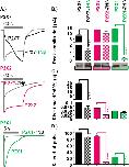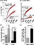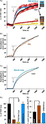 A, FlexStation responses demonstrating agonist-induced dye uptake through the pore of the P2X7 receptor, reduced dye uptake though the N terminus chimeric receptor, and C terminus deletion receptor (P2X7–2Nβ and P2X7 delCcys, respectively) and “P2X7-like” dye uptake through the P2X7–2Nβ delCcys mutant receptor. Agonist addition (300 μm BzATP) at 240 s is indicated by the arrow. S.E. is only shown in one direction to not obscure the mean values. Western blots show equivalent levels of surface expression for the P2X7 receptor WT and mutants. B, P2X7–2Nβ receptor response normalized to the peak P2X7 receptor response identifying an increased initial rate of dye uptake. C, P2X7–2Nβ delCcys receptor response normalized to the peak P2X7 receptor response demonstrating the relative dye uptake speeds through these two receptors. D, histogram summary showing the relative dye uptake for each receptor. E, histogram summary demonstrating the amount of dye uptake (as a percentage of the peak maximum) 1 min after BzATP addition (300 μm BzATP addition made at 240 s). Data are mean ± S.E. **, p < 0.01; ****, p < 0.0001 (n = 7–21). |