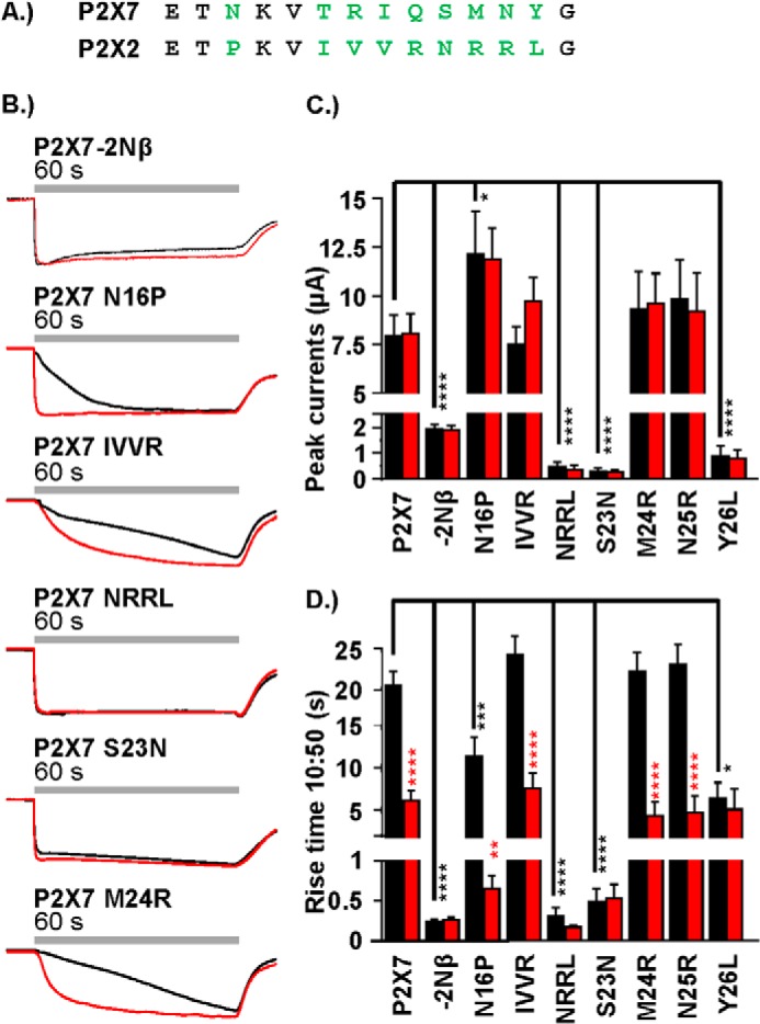 FIGURE 2. Contribution of variant pre-TM1 residues to P2X7 receptor current facilitation.