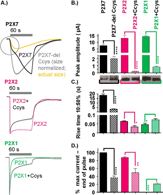 FIGURE 5. Functional interaction between the pre-TM1 β-region and C-terminal cysteine-rich region and its effect on P2X7 receptor time course.