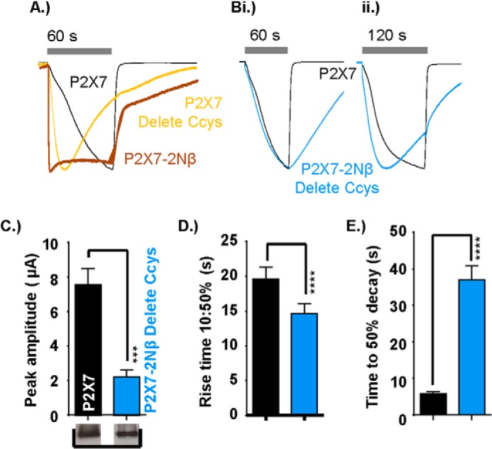 A, peak normalized traces showing the effect of deletion of the cysteine-rich region deletion from the P2X7 receptor (P2XYdelCcys, yellow) compared with the WT P2X7 receptor (black) and the P2X7–2Nβ chimera (red). ATP application is indicated by the gray bars (1 mm for 60 s). B, peak normalized traces showing reversion to slow receptor facilitation at the P2X7–2Nβ delCcys chimera (blue) with both 60-s (i) and 120-s (ii) applications of 1 mm ATP highlighting the faster desensitization of the chimeric receptor. C–E, histograms showing the peak amplitude (microamperes), rise time (seconds), and time to 50% decay (seconds) at the end of the ATP pulse for the P2X7 receptor versus the P2X7–2Nβ delCcys chimera. Western blots show equivalent levels of surface expression of P2X7 and the P2X7–2Nβ delCcys chimera. Data are mean ± S.E. (n = 4–25). ***, p < 0.001 ****, p < 0.0001. |