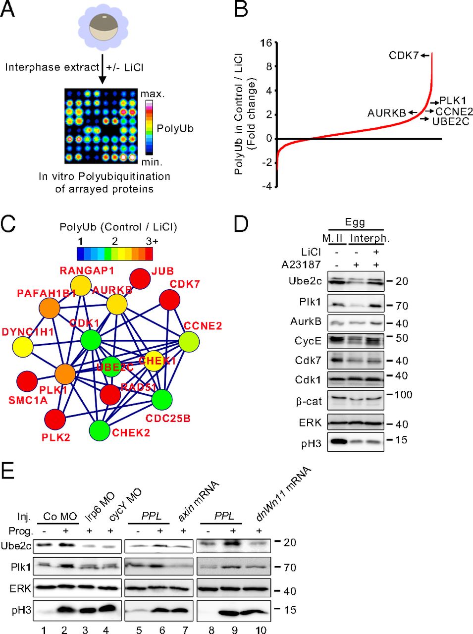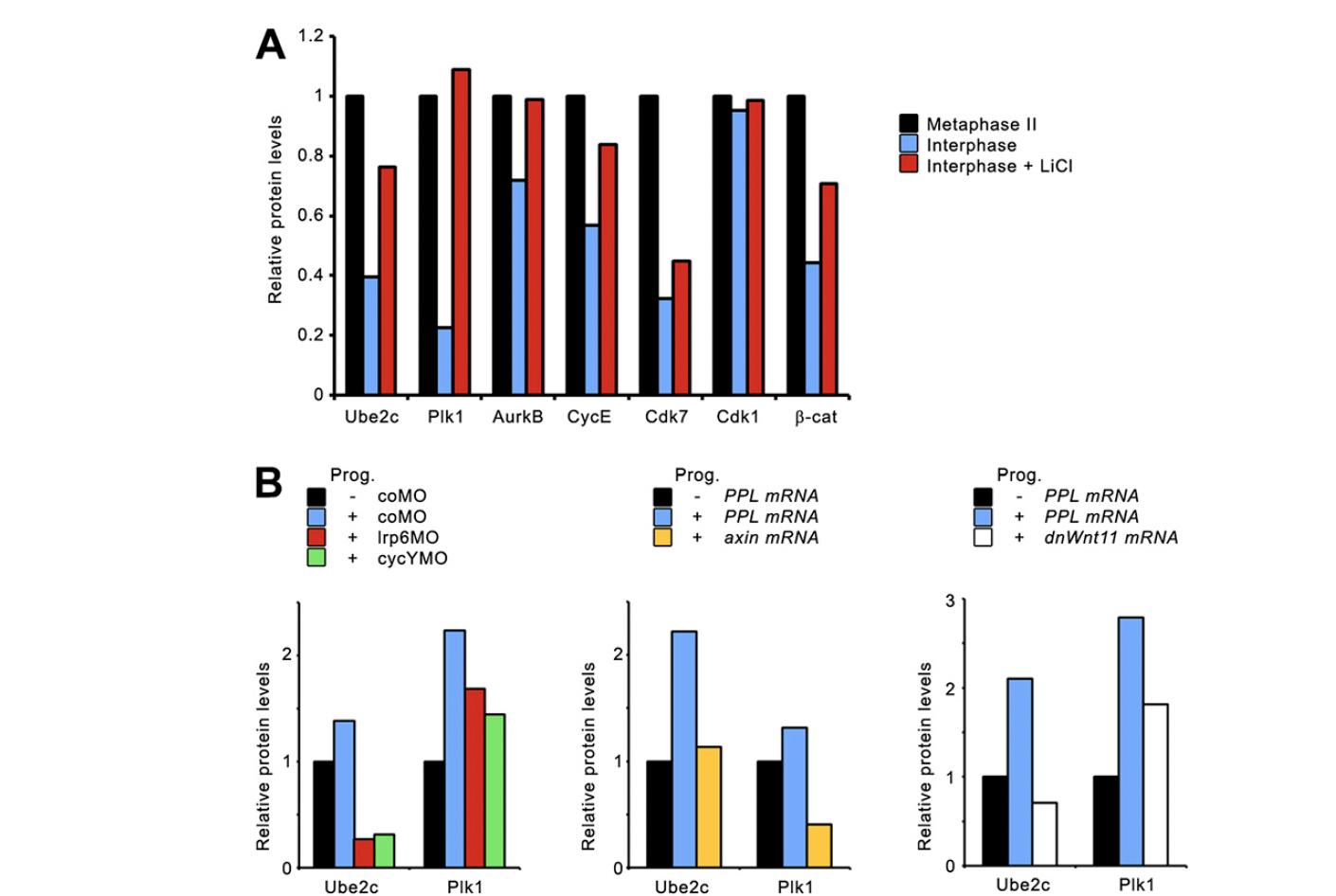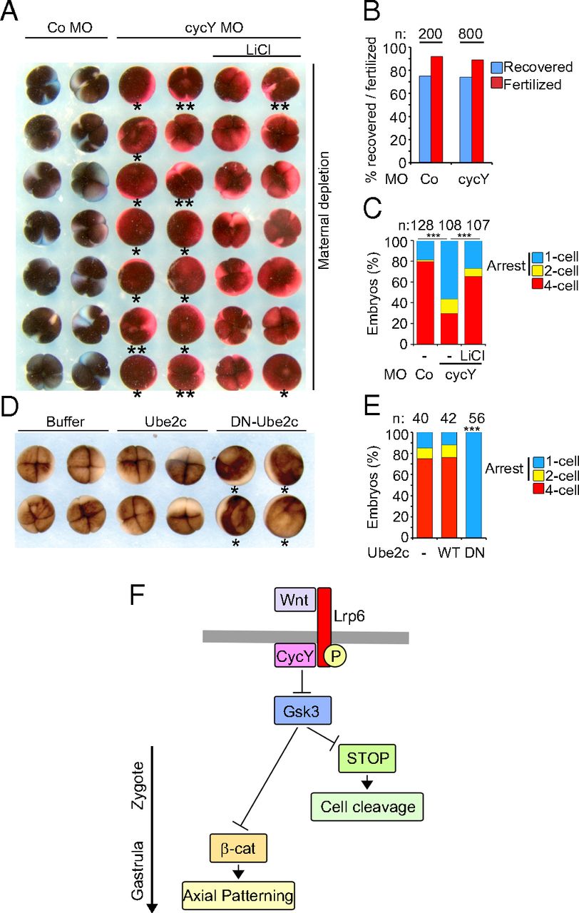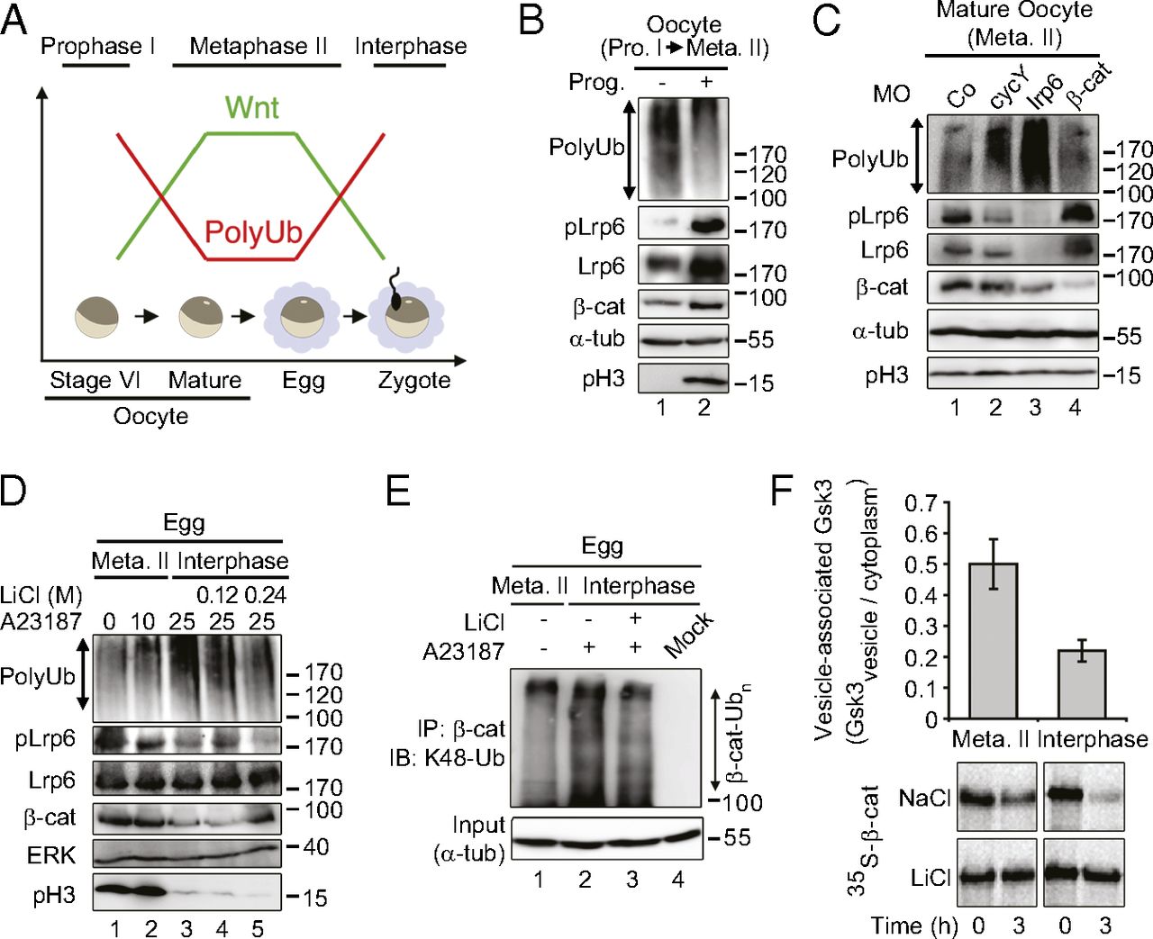 During Xenopus development, Wnt signaling is thought to function first after midblastula transition to regulate axial patterning via β-catenin-mediated transcription. Here, we report that Wnt/glycogen synthase kinase 3 (GSK3) signaling functions posttranscriptionally already in mature oocytes via Wnt/stabilization of proteins (STOP) signaling. Wnt signaling is induced in oocytes after their entry into meiotic metaphase II and declines again upon exit into interphase. Wnt signaling inhibits Gsk3 and thereby protects proteins from polyubiquitination and degradation in mature oocytes. In a protein array screen, we identify a cluster of mitotic effector proteins that are polyubiquitinated in a Gsk3-dependent manner in Xenopus. Consequently inhibition of maternal Wnt/STOP signaling, but not β-catenin signaling, leads to early cleavage arrest after fertilization. The results support a novel role for Wnt signaling in cell cycle progression independent of β-catenin.