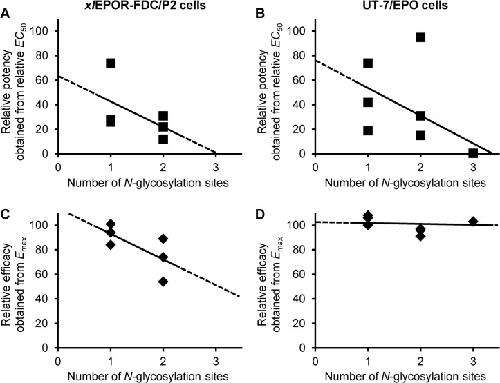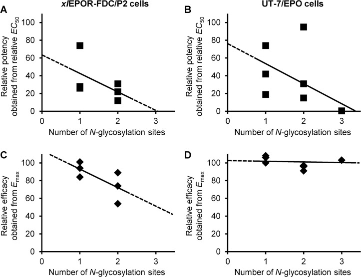 Fig 4. Relationship between carbohydrate content and biological activity.The COS-1 supernatants containing the wild-type xlEPO and the N-glycosylated muteins were assayed by proliferation of xlEPOR-FDC/P2 cells (A, C) and UT-7/EPO cells (B, D). EC50-derived relative potency (A, B) and Emax-derived relative efficacy (C, D) are shown as a percentage relative to the wild-type xlEPO (Table 2) and are plotted against the number of added N-glycosylation sites. Each point represents different xlEPO muteins.