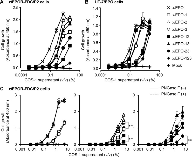 Fig 3. Effects of wild-type xlEPO and the glycosylated muteins on the proliferation of X. laevis and human EPOR-expressing cells.(A, B) The proliferative responses of xlEPOR-FDC/P2 cells (A) and UT-7/EPO cells (B) to the wild-type xlEPO and the N-glycosylated muteins were assessed using the MTS assay. Incubations were performed in triplicate, and the results are presented as the mean (± SD) from 1 of 4 independent experiments. (C) The proliferative responses of xlEPOR-FDC/P2 cells to wild-type xlEPO and the N-glycosylated muteins treated with (dashed line) and without (solid line) PNGase F were also assessed. The PNGase F-treated samples are the same fractions displayed in Fig 2A, bottom panel. Incubations were performed in triplicate, and the results are presented as the mean (± SD) from 1 of 3 independent experiments. **p < 0.01 for the comparison. Symbols are: multiple marks, wild-type xlEPO; open squares, xlEPO-1; open triangles, xlEPO-2; open circles, xlEPO-3; closed squares, xlEPO-12; closed triangles, xlEPO-13; closed circles, xlEPO-23; closed rhombuses, xlEPO-123; plus sign, Mock (control culture supernatant without xlEPO).