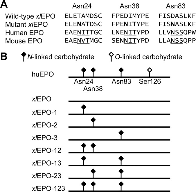 Fig 1. Design of N-glycosylated xlEPO muteins.(A) Schematic drawings of Xenopus laevis erythropoietin (xlEPO) muteins. N- and O-glycosylation sites are indicated by closed and opened rhombuses, respectively. The terms to the left of the bars represent the names of the muteins. âXâ in xlEPO-XXX indicates N-glycosylation positions (1, Asn24; 2, Asn38; 3, Asn83). (B) Amino acid sequences around the introduced N-glycosylation sites in the xlEPO muteins. The parallel sequences of wild-type xlEPO, human EPO, and mouse EPO are also shown. Consensus sequences for N-glycosylation (Asn-Xxx-Ser/Thr) are underlined, with the amino acid substitutions in bold.