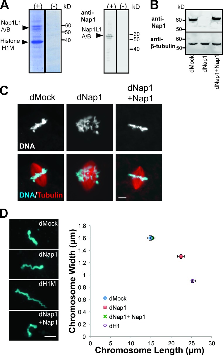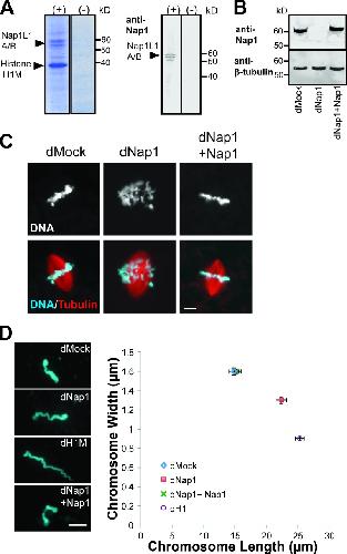 Figure 1. Nap1 binds linker histone H1M in Xenopus egg extracts and is required for normal chromosome condensation. (A) Coomassie-stained gel and Western blot of pull-down with recombinant Strep/His-tagged H1M protein (+) or Strep/His tag alone (â) from Xenopus egg extract. The two bands at 56 and 60 kD were recognized by a Nap1 antibody and identified by 1D liquid chromatographyâtandem mass spectrometry as Nap1L1A and Nap1L1B (NCBI reference sequences NP_001082010 and NP_001080547). (B) Western blot of mock-depleted extract (dMock), Nap1-depleted extract (dNap1), and Nap1-depleted extract supplemented with 1 µM recombinant Nap1 (dNap1+ Nap1). β-Tubulin is shown as a loading control. (C) Fluorescence micrographs of spindles and mitotic chromosomes in mock-depleted extract, Nap1-depleted extract, and Nap1-depleted extract supplemented with 1 µM recombinant Nap1. (D) Individual mitotic chromosome dimensions in mock-depleted (dMock), Nap1-depleted (dNap1), H1M-depleted (dH1M) and Nap1-depleted extracts supplemented with 1 µM recombinant Nap1. Photographs on the left show representative images. Images were thresholded, and mean fiber lengths and widths were plotted. n ⥠80 chromosomes from nine extracts in each condition; error bars are ± SEM, P < 0.001 from unpaired t test for length and breadth between dMock and dNap1, also between dNap1 and dNap1 + Nap1. SDs of chromosome lengths in each condition (µm): dMock = 7.37, dNap1 = 7.98, dNap1 + Nap1 = 6.52, and dH1 = 6.48. SDs of chromosome width in each condition (µm): dMock = 0.35, dNap1 = 0.31, dNap1 + Nap1 = 0.36, and dH1 = 0.23. The distribution of chromosome dimensions is also shown in histograms (Fig. S1, A and B). Bars, 10 µm. |