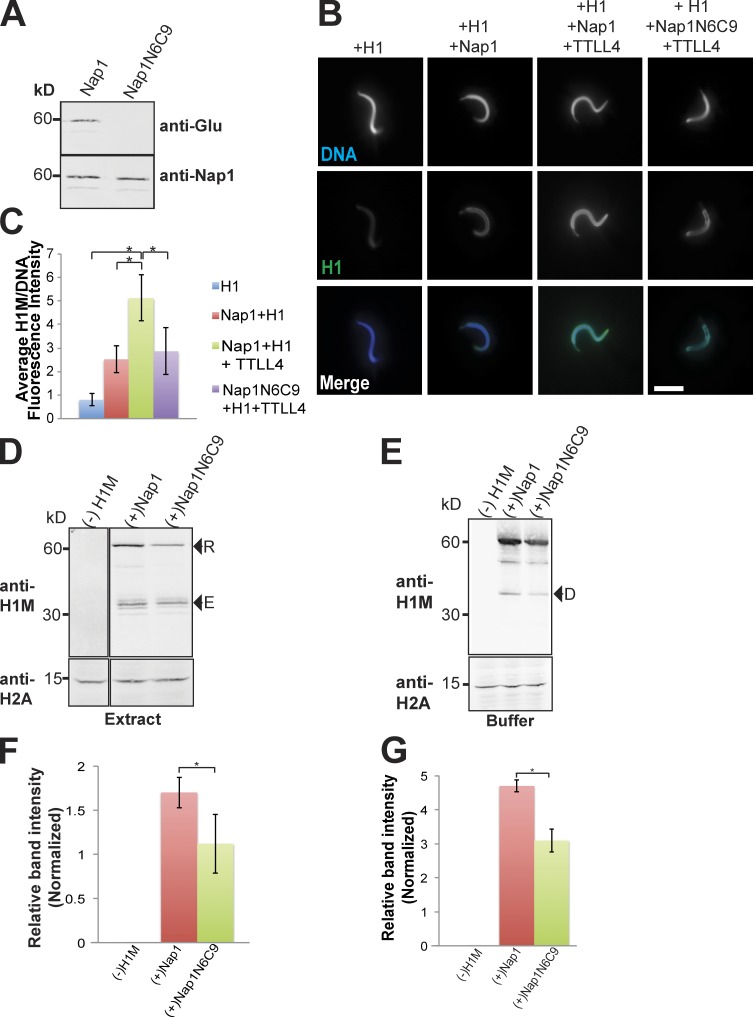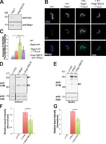 Figure 5. Nap1 glutamylation promotes H1M deposition on sperm or on chromatin beads in extract and in buffer. (A) Representative Western blot of recombinant wild-type or mutant Nap1 proteins incubated with TTLL4 and probed with antibodies that recognize either Nap1 or glutamylated tubulin (anti-Glu). (B) Fluorescence micrographs of Xenopus sperm nuclei combined with 0.2 µM H1M-GFP alone or with equal concentrations of either Nap1 or Nap1N6C9, in the presence or absence of 1 µM TTLL4 enzyme. Bar, 10 µm. (C) Quantification of H1M/DNA fluorescence intensity on structures in B; means ± SD, n ⥠50 structures were evaluated per condition in three separate experiments. *, P < 0.001 in unpaired t test. (D) Western blot of isolated chromatin beads probed with antibodies against H1M. Left column shows chromatin beads assembled in H1M-depleted egg extracts showing that H1M is initially absent from the chromatin. H1M-depleted chromatin beads were then incubated in Nap1-depleted extracts supplemented with either recombinant Nap1 or the Nap1N6C9 mutant and 2 µM H1M-GFP. Greater amounts of both endogenous (E) and recombinant GFP-tagged H1M (R) were recruited to beads in the presence of wild-type Nap1 compared with the glutamylation site mutant. Histone H2A is shown as a loading control. (E) Western blot of isolated chromatin beads probed with antibodies against H1M in a similar experiment performed in buffer. H1M-depleted chromatin beads were incubated in Hepes buffer supplemented with either recombinant Nap1 or the Nap1N6C9 mutant and 2 µM H1M-GFP and the TTLL4 enzyme. A small amount of degraded H1M-GFP (D) is seen on the blot (arrow). Histone H2A is shown as a loading control. (F) Quantification of H1M-GFP band intensities in three experiments from three different extracts as in D; means ± SD. Band intensity for the (â)H1M condition was normalized to 0. *, P = 0.005 by unpaired t test comparing wild-type and mutant conditions. (G) Quantification of mean H1M-GFP band intensities in three experiments as in E; means ± SD. *, P = 0.002 by unpaired t test comparing wild-type and mutant conditions. |