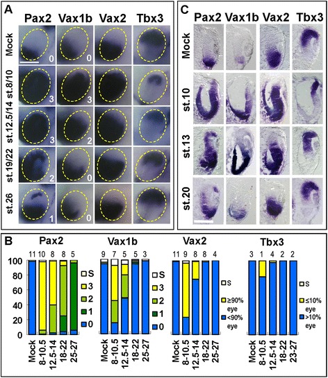 PMP treatments cause stage dependent effects on eye DV polarity. (A) Lateral views of heads of st. 33 embryos treated with DMSO (mock) or 300 to 600 μM PMP from the indicated stages and hybridized with probes for Pax2, Vax1b, Vax2 or Tbx3. In mock-treated embryos, wild-type expression patterns of these genes are detectable: Pax2 and Vax1b staining is restricted to the OS, Vax2-positive region covers the OS and VR, Tbx3 expression identifies the DR. PMP treatments affect gene expression domains to various degrees depending on the stage of delivery (st. 8 to 10, blastula-early gastrula; st. 12.5 to 14, late gastrula-early neurula; st. 19 to 22, late neurula-early optic vesicle; st. 26, mid optic vesicle). For Pax2 and Vax1b, embryos were grouped into 0 to 3 scores (numbers at the bottom right corner of each image) as explained in the âResultsâ section and representative eyes for each score group are shown. See text for details. The broken yellow circles highlight the eye region. Scale bar, 200 μm. (B) Quantification of the percentages of embryos stained for Pax2 or Vax1b with 0 to 3 scores in each treatment condition. Embryos stained for Vax2 or Tbx3 were grouped according to the DV extent of Vax2/Tbx3 expression domain (more or less than 90% of the eye for Vax2; more or less than 10% of the eye for Tbx3). The percentages of embryos with strong eye reductions are also indicated (S, small eyes). The number of experiments performed for each probe and treatment condition is indicated on top of the corresponding histogram bar. At least 20 eyes/10 embryos were analysed for each experiment. (C) Histological sections of eyes of st. 33 embryos treated as in (A) and (B), and hybridized with the indicated probes, confirming stage dependent alterations in the expression domains of Pax2, Vax1b, Vax2 and Tbx3 as detected in whole mount views. Scale bar, 100 μm.