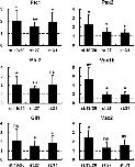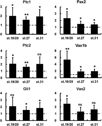 overexpression. Real-time PCR quantification of gene expression in st. 33 heads dissected from controls or from embryos injected with VP16-Gli1-GR mRNA and treated with dex from the indicated stages. Results are shown as the mean ratio between VP16-Gli1-GR-injected and control embryos in six independent experiments. Error bars show standard deviations. *Pâ<â0.05; **Pâ<â0.01; ns, non-significant (Pââ¥â0.05) according to two-tailed Studentâs t-test.