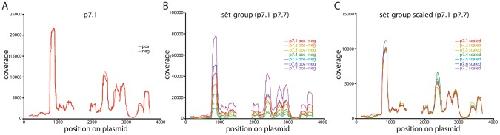 Figure 2. Invitrosome coverage plots for an alternative plasmid backbone (the sèt-group plasmids) also show near identical coverage patterns.2A Example coverage plot for one of the sèt-group plasmids (p7.1) with both forward (pos) and reverse (neg) invitrosomes plotted separately on the same graph. 2B Non-scaled coverage plots with forward and reverse invitrosomes (pos+neg) combined for each of the seven sèt-group plasmids plotted on the same graph. 2C Combined and scaled coverage plots for all seven sèt -group plasmids, where for direct comparison, each plot is normalized to the plasmid with the least coverage and plotted on the same graph.