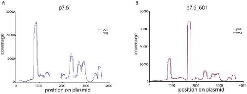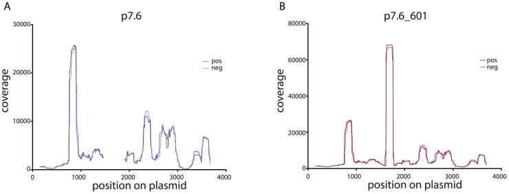 Figure 7. The 601 nucleosome-positioning sequence positions a plurality of invitrosomes.7A Coverage plot for the sèt-group plasmid p7.6 with both forward (pos) and reverse (neg) invitrosomes plotted separately on the same graph. 7B Coverage plot for plasmid p7.6_601 which harbors the 601 nucleosome-positioning sequence with both forward (pos) and reverse (neg) invitrosomes plotted separately on the same graph. The highest peak starting at about base pair 1600 is where the 601 sequence begins.