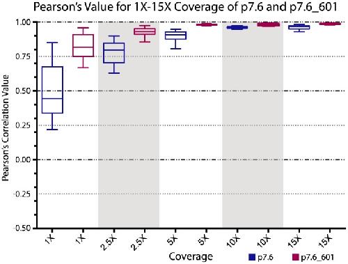 Figure 8. Higher degree of correlation between coverage of p7.6_601 compared to coverage of p7.6.Range of correlation values for coverage levels 1X, 2.5X, 5X, 10X and 15X are displayed as a whisker plot. The correlation values from the pair-wise comparisons of the six replicates for plasmid p7.6 and the six replicates for plasmid p.7.6_601 are displayed as blue whisker boxes and purple whisker boxes respectively. The Pearson's correlation values are on the y-axis and the coverage levels are on the x-axis.