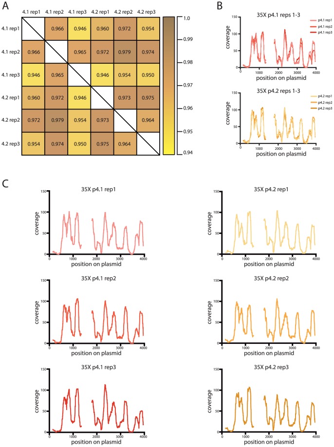 Figure 4. High correlations are maintained at experimentally relevant invitrosome coverage levels.4A Pearson's correlation matrix for the coverage plots generated from three replicates at 35X coverage of plasmids p4.1 and p4.2. 4B (top) Combined coverage plots for replicates 1-3 of plasmid p4.1 at 35X and (bottom) combined coverage plots for replicates 1-3 of plasmid p4.2 at 35X. 4C All six replicates of the 35X coverage plots. (Left) coverage plots of replicates 1-3 of plasmid p4.1 at 35X. (Right) coverage plots of replicates 1-3 of plasmid p4.2 at 35X.