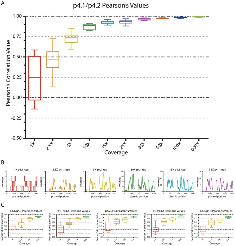 Figure 5. Comparison of correlation values show minimal acceptable coverage levels for invitrosome experiments.5A Range of correlation values at each coverage level for the pair-wise comparisons of the three replicates for plasmid p4.1 and the three replicates for plasmid p.4.2. The Pearson's correlation values are on the y-axis and the coverage levels are on the x-axis. The range of correlation values for each coverage level is plotted as a whisker plot composed of the 30 pair-wise comparisons at each coverage level. 5B Coverage plots for replicate 1 of plasmid p4.1 at coverage levels: 1X, 2.5X, 5X, 10X, 15X and 35X. The colors of the coverage plots correspond to the whisker-plot colors of the same coverage levels in 5A. 5C Whisker plot graphs showing the variability of correlation values at low levels of coverage (1X-10X) for all combinations of the kat-group plasmids. In 5A–5C the colors red, orange, yellow, green, indigo and purple represent data from coverage levels of 1X, 2.5X, 5X, 10X, 15X and 35X, respectively.