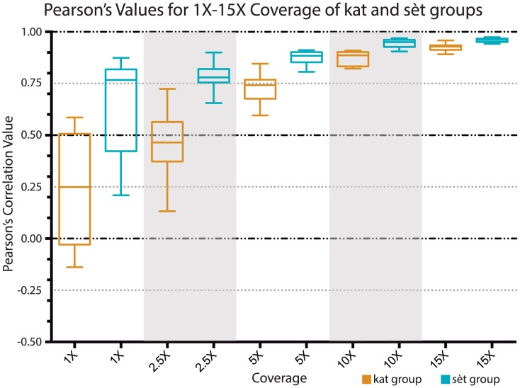 Figure 6. Higher degree of correlation between low-level coverage of sèt-group plasmids compared to low-level coverage of kat-group plasmids.Range of correlation values for coverage levels 1X, 2.5X, 5X, 10X and 15X are displayed as a whisker plot. The pair-wise comparisons of the three replicates for plasmid p4.1 and the three replicates for plasmid p.4.2 from the kat-group plasmids are displayed as orange whisker-boxes and the pair-wise comparisons of the three replicates for plasmid p7.1 and the three replicates for plasmid p.7.2 from the sèt-group plasmids as blue whisker-boxes. The Pearson's correlation values are on the y-axis and the coverage levels are on the x-axis.