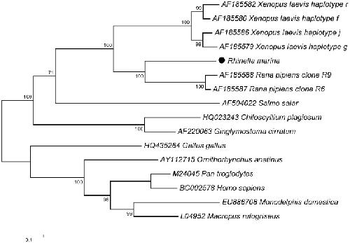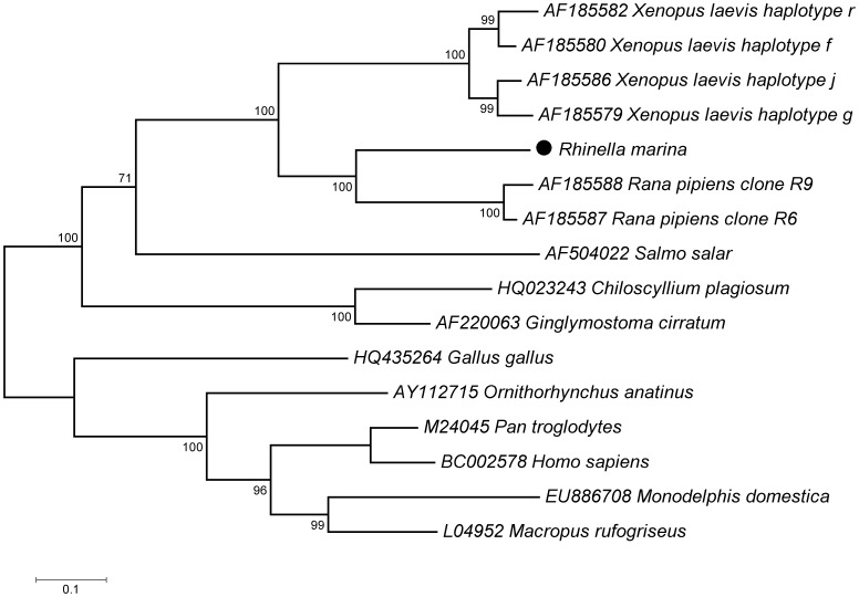 Figure 2. Phylogenetic tree comparing Rhinella marina MHC class I to other vertebrates.Maximum likelihood phylogenetic tree using General Time Reversible model of nucleotide substitution with invariant sites (rooted on midpoint) of MHC class I in cane toad, Rhinella marina, African clawed frog, Xenopus laevis, northern leopard frog, Rana pipiens, Atlantic salmon, Salmo salar, whitespotted bamboo shark, Chiloscyllium plagiosum, nurse shark, Ginglymostoma cirratum, chicken, Gallus gallus, platypus, Ornithorhynchus anatinus, gray short-tailed opossum, Monodelphis domestica, red-necked wallaby, Macropus rufogriseus, common chimpanzee, Pan troglodytes, and human, Homo sapiens. Sequence titles include Genbank accessions.