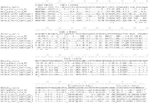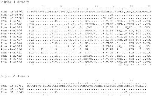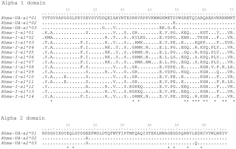 Figure 3. Amino acid alignment of MHC class I alpha 1 domain and alpha 2 domain variants.Putative peptide binding sites are indicated with * under each alignment.