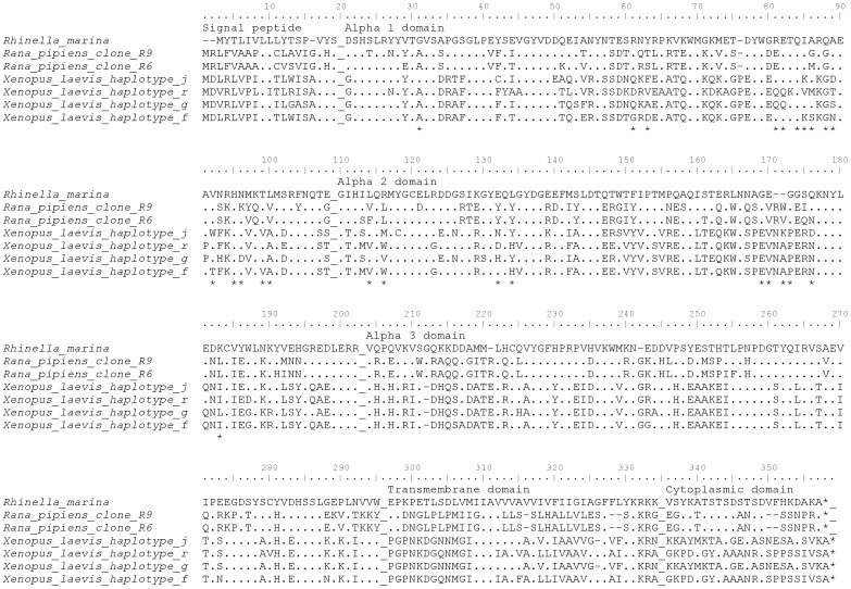 Figure 1. Amino acid alignment of anuran MHC class I.ClustalW alignment of MHC class I from Rhinella marina, Rana pipiens (MHC class I clone R6 Genbank accession no.: AF185587 and R9: AF185588) and Xenopus laevis (MHC class I haplotype g: AF188579; haplotype f: AF188580; haplotype r: AF188582 and haplotype j: AF188586); * indicate putative peptide binding residues as predicted from Flajnik et al. 1999.