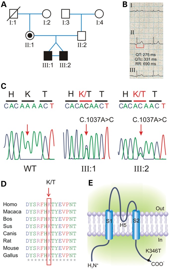 Figure 1. Mutation detection by sequence analysis of the KCNJ2 coding region. (A) Pedigree of the family harboring a novel mutations in KCNJ2. Squares are males and circles females; solid black symbols represent propositi and slash deceased individual. (B) ECG recording from propositi showing shortened QT interval (heart rate, 87 bpm; QT 275 ms; paper speed 25 mm/s). (C) Electropherograms showing the heterozygous c.1037A>C transition (arrow-headed), predicting a novel non-synonymous p.K346T variant in propositi compared with the sequence of a healthy individual (WT). (D) Alignments of several KCNJ2 sequences flanking the K346T substitution (K/T, arrow-headed) showing that this residue is highly conserved in several vertebrate species. (E) Schematic representation of the membrane topology of a human Kir2.1 subunit indicating the position of the p.K346T variant. |