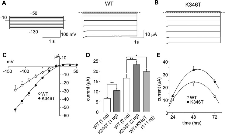 Figure 2. The K346T mutation increases Kir2.1 currents. Sample current families recorded from oocytes expressing WT (A) or K346T (B) mRNA (the pulse protocol is shown as inset). (C) I–V relationships for WT (white circles, 3 ng) and K346T (black circles, 3 ng) channels. (D) Current amplitudes recorded at −100 mV from cells injected with the indicated mRNAs whose amounts are reported in brackets (mean ± SEM; n = 120; *P < 0.05; **P < 0.01). (E) Current amplitudes recorded at −60 mV for WT (white circles) and K346T (black circles) channels and plotted as a function of time after mRNA injection (mean ± SEM; n = 6). |