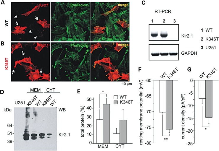 Figure 3. Characterization of astrocytoma cells expressing WT and K346T channels. Co-immunofluorescences of cells expressing WT (A) or K346T (B) channels with anti-Kir2.1 pAb (red) and FITC-conjugated phallacidin (green) show that WT channels are localized in perinuclear vesicles (short arrows in A) and occasionally at plasma membranes (long arrows in A), while mutated channels are mainly expressed at plasma membranes (long arrows in B). Scale bar: 10 μm. (C) RT-PCR analysis of Kir2.1 mRNA in WT (1), K346T (2) channel or empty-vector expressing U251 cell lines (3). GAPDH housekeeping gene normalizes the amount of template. (D) WB analysis of membrane (MEM) and cytosolic (CYT) proteins derived from WT or K346T Kir2.1-expressing cells after Histidine co-purification. Molecular weight markers are on the left (kDa). (E) Densitometric analysis of protein bands from four independent experiments (mean ± SEM, *P < 0.05). (F) The resting membrane potential and (G) current density (at −100 mV) were evaluated in cells expressing WT (white bars) or K346T (gray bars) channels (data are mean ± SEM; n = 6; *P < 0.05; **P < 0.01). |