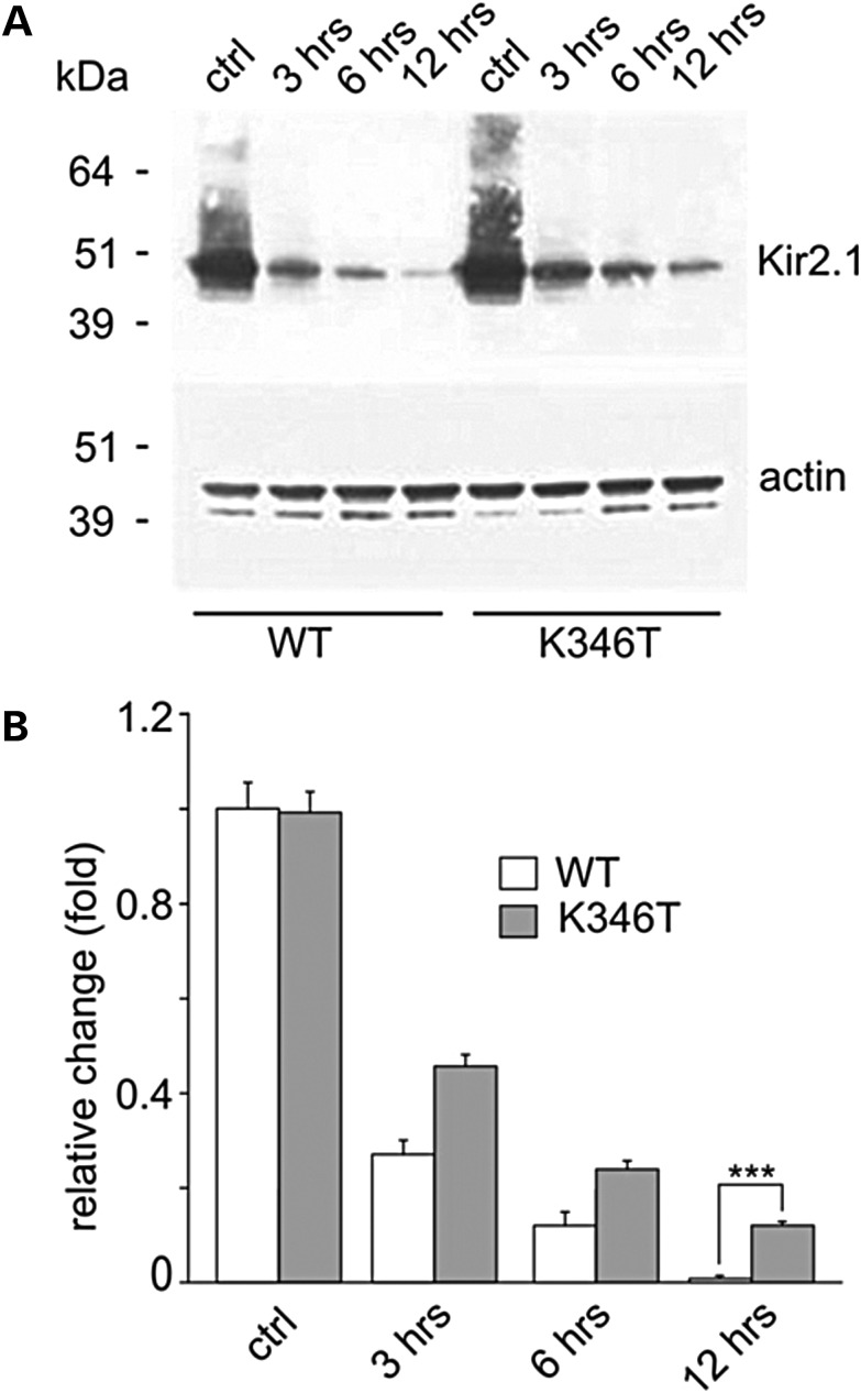 Figure 4. The K346T mutation increases protein stability. (A) WB analysis of protein extracts derived from cells expressing WT and K346T channels treated with the protein synthesis inhibitor cycloheximide for 3, 6 and 12 h. WT protein degradation is almost complete after 12 h treatment, while K346T protein is still detectable at this time. Actin is used as loading control. Molecular weight markers are on the left (kDa). (B) Densitometric analysis of protein bands normalized with respect to the amount of either WT (white bar) or K346T (gray bar) Kir2.1 protein in control conditions. Data are expressed as mean ± SEM from four independent experiments (***P < 0.001). |