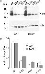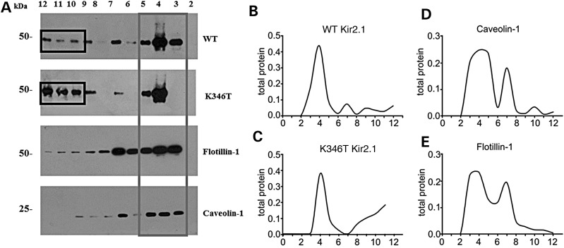 Figure 5. The K346T mutation affects the distribution of Kir2.1 channels in membrane lipid rafts. (A) WB analysis of cholesterol-rich (triton insoluble fractions: 3â5) and cholesterol-poor membrane fractions (triton soluble fractions: 10â12) of WT or K346T Kir2.1-expressing cells. WT channels are mainly distributed in triton insoluble fractions (gray box), whereas K346T is also abundantly localized in cholesterol-poor fractions (black boxes). Cav-1 and flotillin-1 identify the caveolar raft fractions. Molecular weight markers are on the left (kDa). (BâE) Normal distributions of total protein (indicated on top) in membrane fractions isolated by sucrose density gradient. The levels of protein in each fraction are normalized to the total protein amount recovered from all the fractions together. |