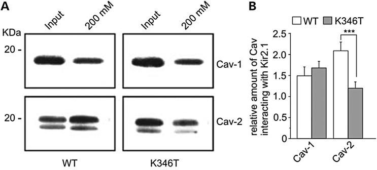 Figure 6. The K346T mutation reduces Kir2.1 channels interaction with Cav-2. (A) WB analysis of Kir2.1 channel's interactors after Histidine (His) co-purification of astrocytoma cells expressing WT or K346T channels. Input lanes represent protein extracts before His co-purification. WT and K346T channels co-purify similarly with Cav-1, whereas the K346T mutation reduces the association with Cav-2. One representative experiment out of three is shown. Molecular weight markers are indicated on the left (kDa). (B) Densitometric analysis (ratio) of protein bands corresponding to Cav-1 and Cav-2 normalized respect to WT (white bars) or K346T (gray bars) Kir2.1 protein levels. Data are expressed as mean ± SEM from three independent experiments (***P < 0.001). |