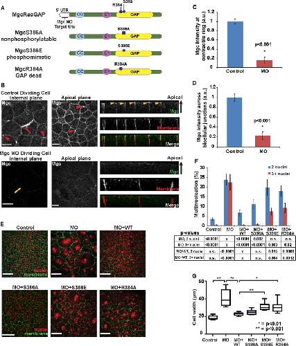 FIGURE 1:. MgcRacGAP localizes to cell–cell junctions, and Mgc MO, MO + MgcS386E, and MO + R384A exhibit cytokinesis defects. (A) Protein diagram of Mgc showing location of Arg-384 and Ser-386 within the GAP domain, as well as mutants used in this study. (B) Internal and apical plane en face views and side views of endogenous Mgc localization in fixed embryos injected with either mChe-membrane alone (top) or MO + mChe-membrane (bottom) and then stained with an anti-Mgc antibody. Red arrowheads indicate midbodies; red arrow indicates the contractile ring in control embryo; yellow arrow indicates attempted division site in MO embryo; yellow arrowheads indicate apical localization of endogenous Mgc at cell–cell junctions. Scale bars, 20 μm. (C) Normalized intensity of endogenous Mgc at the contractile ring in control or MO embryos during early ingression measured from embryos that were fixed and stained with an anti-Mgc antibody. Control (number of cells, embryos, and independent experiments, respectively [n] = 10, 7, 4), MO (n = 11, 7, 4). (D) Peak intensity determined from line scans measuring the normalized Mgc intensity across bicellular junctions. Control (n = 20, 5, 4), MO (n = 18, 6, 3). (E) Images of fixed embryos injected with MO or MO + MgcWT or GAP-domain mutants. mChe-membrane marker (pseudocolored green) was used as an injection marker, and embryos were stained with DAPI (pseudocolored red). Scale bars, 40 μm. (F) Quantification of the percentage of cells that display multinucleation. The p values from Student's t tests were calculated from comparisons of MO cells with two nuclei or with three or more nuclei pairwise to the respective nuclei group for each indicated construct. The same analysis was conducted for pairwise comparison of MO + WT with two nuclei or with three or more nuclei to each indicated construct. Control (n = 266, 9, 3), MO (n = 184, 9, 6), MO + WT (n = 275, 9, 6), MO + S386A (n = 247, 8, 5), MO + S386E (n = 275, 7, 5), and MO + R384A (n = 202, 5, 4). (G) Quantification of cell width graphed as a box-and-whiskers plot. Control (n = 333, 6, 3), MO (n = 120, 9, 3), MO + WT (n = 208, 8, 3), MO + S386A (n = 264, 9, 3), MO+S386E (n = 207, 7, 3), and MO+R384A (n = 219, 10, 3). All error bars shown represent SEM unless otherwise noted. |