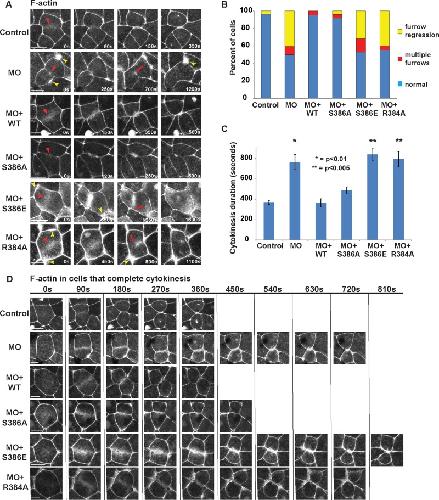 FIGURE 2:. Mgc MO, MO + MgcS386E, and MO + MgcR384A exhibit cytokinesis failure and significant delays in cytokinesis completion in vivo. (A) Frames from time-lapse movies during cytokinesis. Embryos were coinjected with the indicated MO and rescue constructs along with mChe-UtrCH (F-actin probe) and mChe-H2B. Red arrowheads point to the contractile ring during early cytokinesis; red arrows indicate cleavage furrow regression; yellow arrowheads point to F-actin–rich junctional accumulations. (B) Quantification of the outcome of cytokinesis showing the percentage of cells that complete cytokinesis normally, fail cytokinesis with cleavage furrow regression, or fail cytokinesis with formation of multiple cleavage furrows. Control (number of cells, embryos, and independent experiments, respectively [n] = 26, 9, 4), MO (n = 29, 8, 4), MO + WT (n = 20, 7, 4), MO + S386A (n = 53, 13, 5), MO + S386E (n = 48, 12, 5), and MO + R384A (n = 19, 3, 3). (C) Quantification of cytokinesis duration. Error bars represent SEM. The p values were calculated from pairwise comparison to MO + MgcWT. Control (n = 20, 7, 5), MO (n = 17, 8, 7), MO + WT (n = 17, 11, 7), MO + S386A (n = 22, 12, 5), MO+S386E (n = 20, 9, 4), and MO + R384A (n = 20, 9, 4). (D) Frames from time-lapse movies of cells expressing mChe-UtrCH (F-actin probe) that do manage to complete cytokinesis successfully show that the MO, MO + MgcS386E, and MO + MgcR384A cells display significantly longer cytokinesis duration than control or MO + MgcWT. Scale bars, 20 μm. |