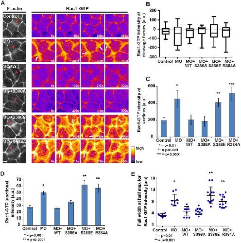 FIGURE 4:. Mgc MO, MO + MgcS386E, and MO + MgcR384A embryos exhibit increased accumulation of Rac1-GTP at cell junctions. (A) Frames from time-lapse movies showing F-actin (mChe-UtrCH) at time 0 s (presence of contractile ring indicates dividing cells) and Rac1-GTP in the same cells starting at time 0 s and following cytokinesis over time. Red arrowheads indicate the contractile ring, and white arrows point to regions of Rac1-GTP accumulation. Scale bars, 20 μm. (B) Quantification of the normalized Rac1-GTP intensity at the cleavage furrow during early cytokinesis (∼25% cleavage furrow ingression) graphed as a box-and-whiskers plot. A negative value indicates that the Rac1-GTP intensity outside of the cleavage furrow is higher than at the furrow. Control (number of cells, embryos, and independent experiments, respectively [n] =18, 4, 4), MO (n = 10, 4, 4), MO + WT (n = 12, 3, 3), MO + S386A (n = 11, 5, 2), MO + S386E (n = 14, 5, 4), and MO + R384A (n = 15, 5, 4). (C) Quantification of normalized Rac1-GTP intensity measured from an ROI positioned at cell vertices (tricellular junctions). Control (n = 12, 3, 3), MO (n = 10, 4, 4), MO + WT (n = 12, 4, 4), MO + S386A (n = 10, 4, 2), MO + S386E (n = 22, 5, 3), and MO + R384A (n = 16, 7, 4). (D) Quantification of the peak intensity of normalized Rac1-GTP line scans across bicellular junctions of dividing cells during early cleavage furrow ingression. Error bars represent SEM. Control (n = 9, 5, 5), MO (n = 10, 3, 3), MO + WT (n = 11, 6, 5), MO + S386A (n = 10, 4, 2), MO + S386E (n = 12, 5, 3), and MO + R384A (n = 12, 6, 4). (E) Full-width at half-maximum quantification of normalized Rac1-GTP intensity line scans to highlight the difference in breadth of the Rac1-GTP signal across bicellular junctions (see Materials and Methods). Error bars represent SEM unless otherwise noted. The p values were calculated from pairwise comparisons to MO + MgcWT. |