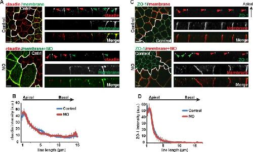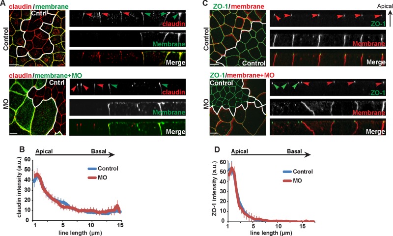 FIGURE 7:. MgcRacGAP is not required for proper TJ structure. (A) Fixed en face or side view images of mosaic embryos, where all cells in the field of view are stained for endogenous claudin (red), and the cells expressing GFP-membrane marker (green) contain marker alone (control) or marker + MO (MO). White lines represent separation between mosaic regions. Red arrowheads indicate claudin localization in control regions of the embryo, and green arrowheads indicate claudin localization in regions expressing the injection marker. Scale bars, 20 μm. (B) Quantification of normalized claudin intensity along the apical-to-basal axis of bicellular junctions. Error bars represent SEM. Control (number of cells, embryos, and independent experiments, respectively [n] =16, 5, 3), MO (n = 14, 5, 3). (C) Fixed en face or side view images of mosaic embryos, where all cells in the field of view are stained for endogenous ZO-1 (green), and the cells expressing mChe-membrane marker (red) contain marker alone (control) or marker + MO (MO). White lines represent separation between mosaic regions. Green arrowheads indicate ZO-1 localization in control regions of the embryo, and red arrowheads indicate ZO-1 localization in regions expressing the injection marker. Scale bars, 20 μm. (D) Quantification of normalized ZO-1 intensity along the apical-to-basal axis of bicellular junctions. Error bars represent SEM. Control (n = 15, 6, 3), MO (n = 13, 5, 3). |