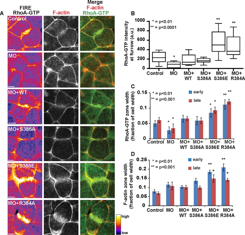 FIGURE 3:. MO + MgcS386E and MO + MgcR384A embryos exhibit increased accumulation of RhoA-GTP and F-actin at the contractile ring in epithelial cells. (A) Images of cells during early cytokinesis (∼25% ingression) from time-lapse movies, showing the RhoA-GTP zone (GFP-rGBD), with a FIRE look-up table applied to the RhoA-GTP channel, F-actin accumulation (mChe-UtrCH), and merge. Embryos were coinjected with indicated Mgc MO and rescue constructs. Scale bars, 20 μm. (B) Quantification of the normalized RhoA-GTP intensity at the cleavage furrow during early cytokinesis (∼25% ingression) graphed as a box-and-whiskers plot. Control (number of cells, embryos, and independent experiments, respectively [n] = 14, 3, 2), MO (n = 11, 6, 4), MO + WT (n = 13, 5, 3), MO + S386A (n = 10, 6, 3), MO + S386E (n = 17, 6, 2), and MO + R384A (n = 18, 5, 3). (C) Quantification of the width of the RhoA-GTP zone as a fraction of overall cell width in both early and late cytokinesis (∼25 and 75% ingression, respectively). Control (n = 7, 4, 3), MO (n = 8, 6, 3), MO + WT (n = 8, 6, 5), MO + S386A (n = 11, 8, 3), MO + S386E (n = 13, 7, 3), and MO + R384A (n = 12, 5, 2). (D) Quantification of the width of F-actin accumulation at the contractile ring as a fraction of overall cell width during both early and late cytokinesis (∼25 and 75% ingression, respectively). Control (n = 7, 4, 3), MO (n = 8, 6, 3), MO + WT (n = 8, 6, 5), MO + S386A (n = 11, 8, 3), MO + S386E (n = 13, 7, 3), and MO + R384A (n = 12, 5, 2). Error bars represent SEM unless otherwise noted. The p values were calculated from pairwise comparison to MO + MgcWT. |