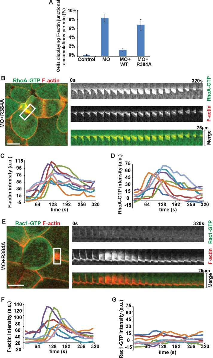 FIGURE 5:. Disrupting MgcRacGAP's GAP activity results in dynamic junctional accumulations of F-actin and RhoA-GTP. (A) Quantification of the average percentage of cells with F-actin junctional accumulations per minute. Error bars represent SEM. Control (number of cells, embryos, and independent experiments, respectively [n] =335, 10, 8), MO (n = 128, 10, 6), MO + WT (n = 202, 10, 8), and MO + R384A (n = 163, 10, 4). (B) Brightest point projection images were used to generate kymographs across a junction where an F-actin accumulation occurs in MO + R384A embryos. Kymographs of RhoA-GTP (green) and F-actin (red). The white rectangle indicates the region of the kymograph. Scale bar in en face view, 10 μm. (C) Quantification of the normalized F-actin junctional accumulation intensity over time (n = 8, 4, 4). (D) Quantification of the normalized RhoA-GTP junctional accumulation intensity over time for the same regions quantified in C. (E) Brightest point projection images were used to generate kymographs across a junction where an F-actin accumulation occurs in MO + R384A embryos. Kymographs of Rac1-GTP (green) and F-actin (red). The white rectangle indicates the region of the kymograph. Scale bar in en face view, 10 μm. (F) Quantification of the normalized F-actin junctional accumulation intensity over time (n = 8, 5, 3). (G) Quantification of the normalized Rac1-GTP junctional accumulation intensity over time for the same regions quantified in F. Notice that there is not an increase in local Rac1-GTP intensity at the site of F-actin junctional accumulations. |