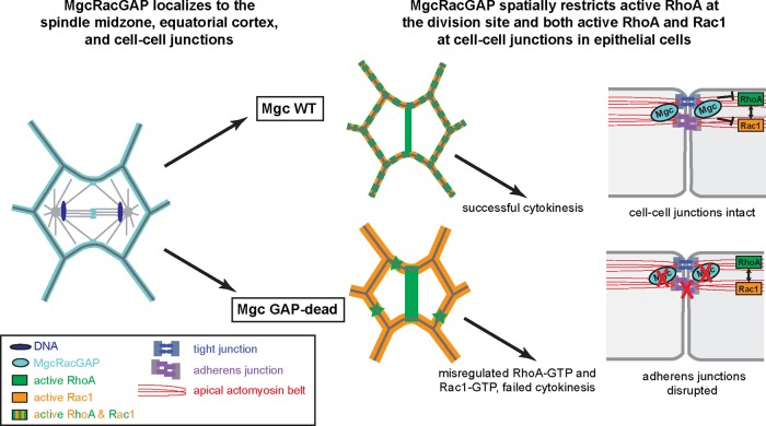 MgcRacGAP restricts active RhoA at the cytokinetic furrow and both RhoA and Rac1 at cell-cell junctions in epithelial cells.