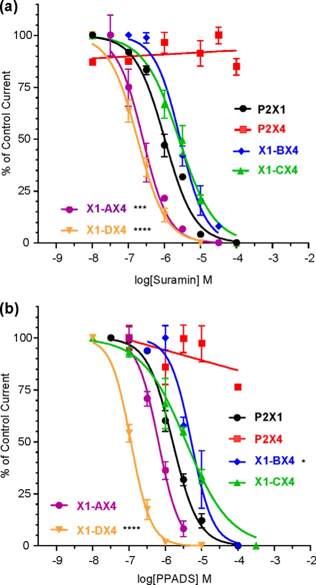 a, comparison of suramin action in WT receptors and chimeras. b, PPADS inhibition curves for chimeric and WT receptors. In all cases, antagonist action was determined against an EC90 of ATP. Asterisks indicate a significant shift from the WT P2X1 receptor. **, p < 0.05; ***, p < 0.0001.