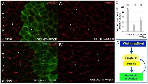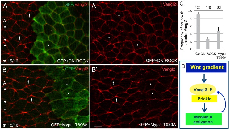 Fig. 6. Feedback regulation of AP-PCP by the ROCK/Myosin II pathway.(A,B) Eight cell embryos were unilaterally coinjected with the lineage tracer (GFP RNA, 100â pg) and DN-ROCK RNA (100â pg, A) or Mypt1T696A RNA (100â pg, B) and Vangl2 polarity was assessed by immunostaining at the neural plate stage. Both the interference with ROCK signaling (A,Aâ²) and the dephosphorylation of Myosin II light chain by the myosin phosphatase Mypt1 (B, Bâ²) inhibit Vangl2 polarity. Arrows point to polarized Vangl2 staining. Asterisks indicate treated cells marked by GFP with non-polarized Vangl2. (C) Quantification of the data shown in A,B. Error bars represent s.d. (D) Model of AP-PCP. Wnt activity gradient leads to the polarization of the Vangl2/Pk complex to the anterior cell domain. Myosin II activity, a putative target of PCP signaling, mediates feedback regulation of core PCP protein localization. Scale bar, 20â µm. |
